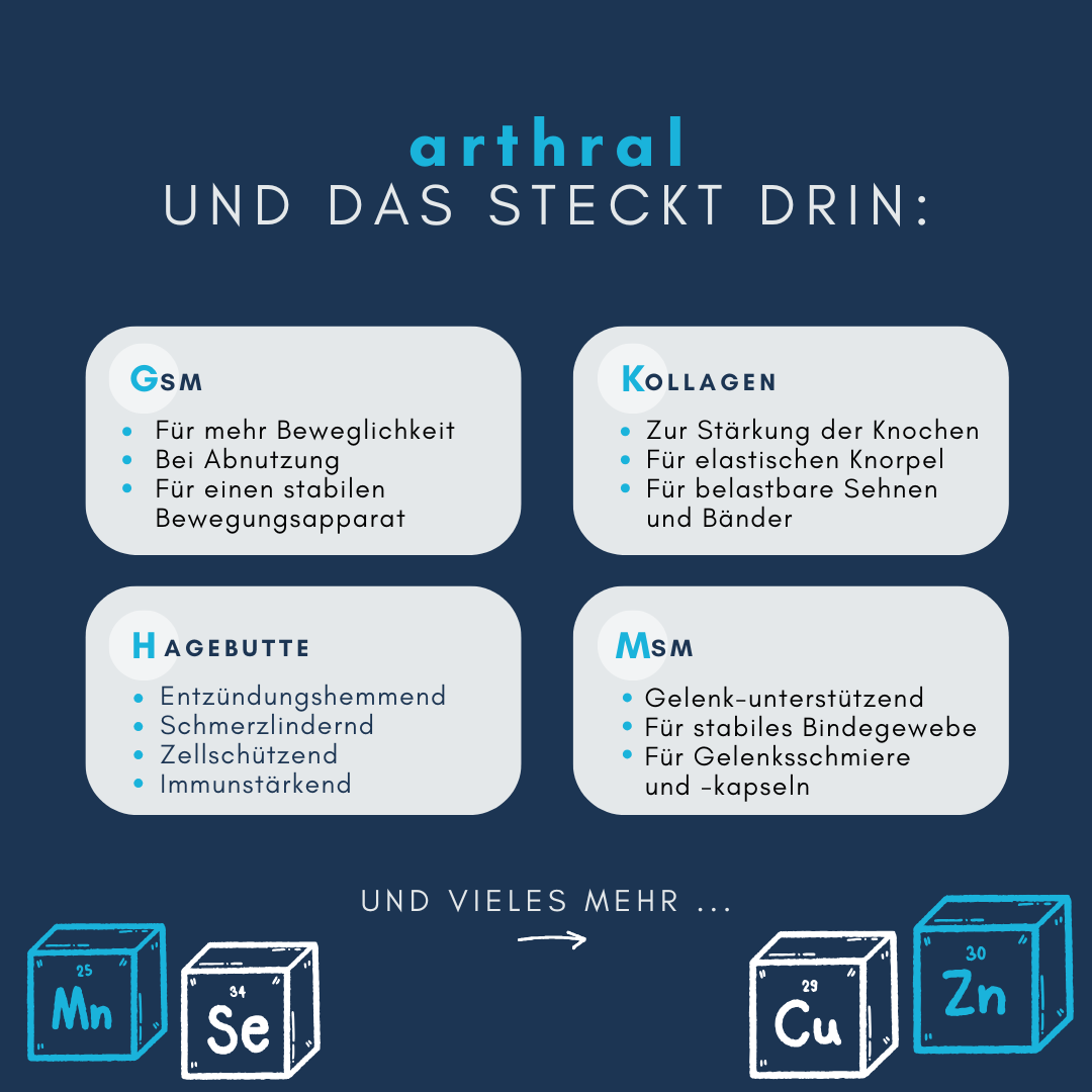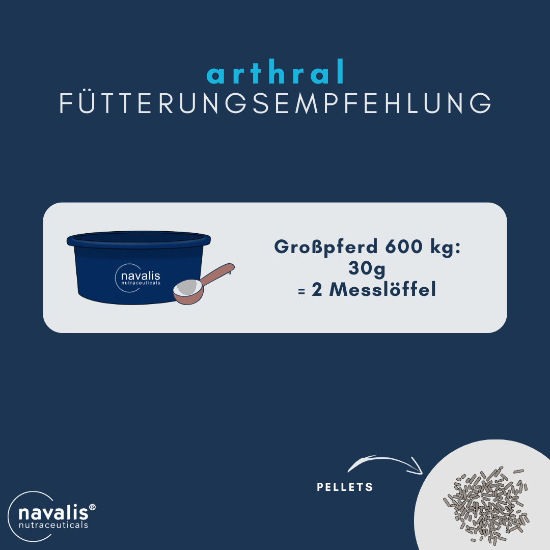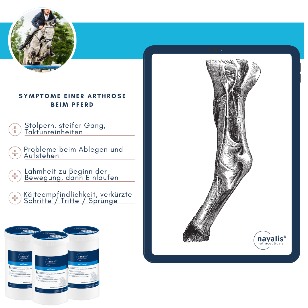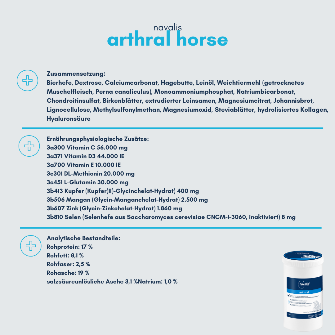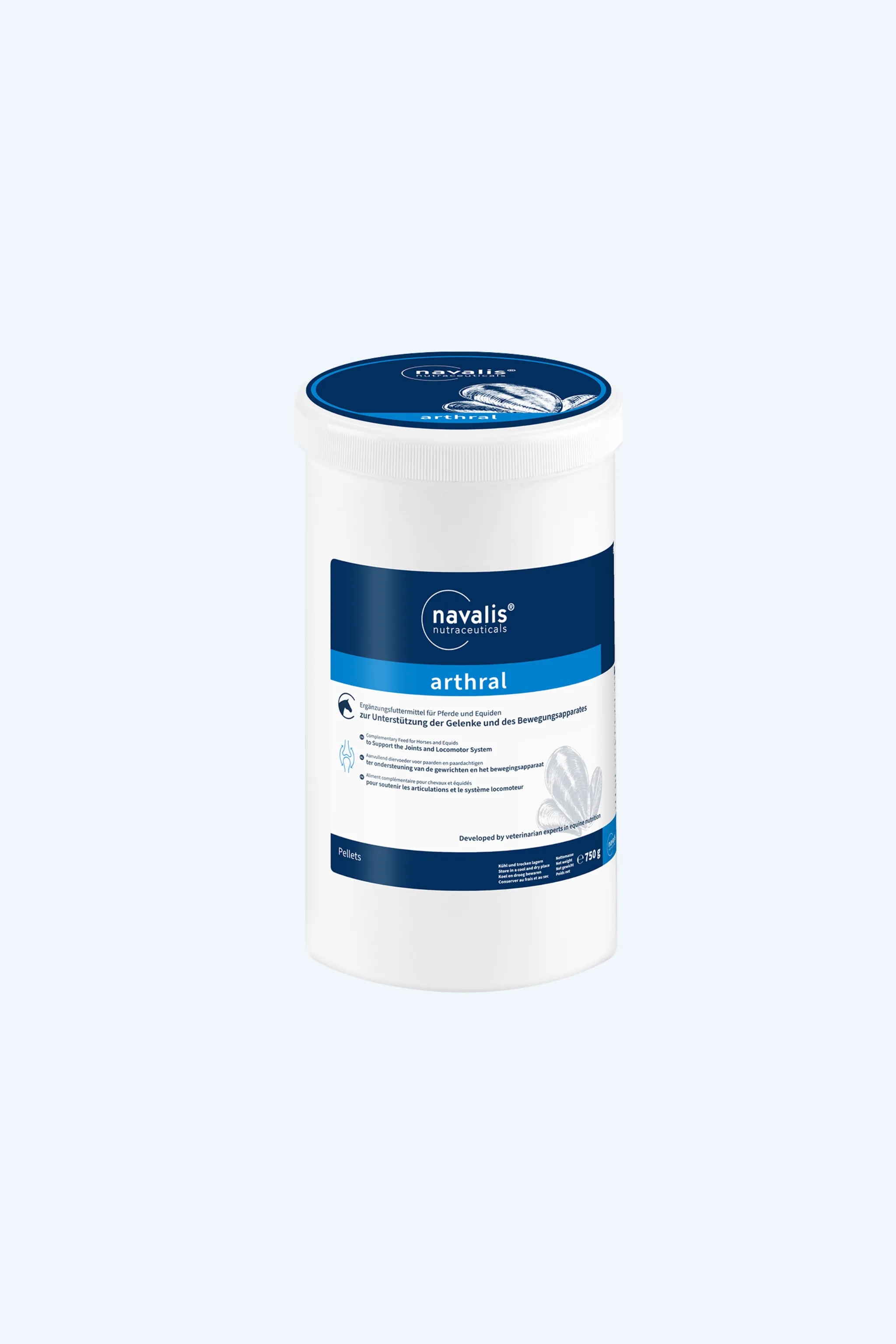 Optimale Unterstützung für Gelenke und Beweglichkeit bei Pferden. Ein funktionierender Gelenkstoffwechsel ist essenziell für die dauerhafte Beweglichkeit und Leistungsfähigkeit von Pferden. navalis arthral horse liefert eine gezielte Kombination aus wertvollen Mikronährstoffen und gelenkwichtigen Substanzen, um den Erhalt, die Regeneration und den Aufbau von Gelenk- und Bindegewebsstrukturen zu fördern. Einsatzbereiche von navalis arthral: Regulierung des Gelenkstoffwechsels und Ausgleich von Dysbalancen, Unterstützung der Stabilität und Regeneration von Gelenken und Bindegewebe, Schutz der Gelenke durch eine ausgewogene Wirkstoffformel, Aktivierung gelenkspezifischer Enzymsysteme für den Knorpelaufbau. Essenzielle Nährstoffe für gesunde Gelenke: MSM: Unterstützt die Gelenkgesundheit und sorgt für Elastizität im Gewebe, Chondroitin: Fördert die Widerstandsfähigkeit und Stabilität des Knorpels, Kollagen: Zentrales Strukturprotein für belastbare Gelenke. navalis arthral kann ideal mit navalis doloral kombiniert werden. In einer first-line/second-line-Strategie wird zunächst mit doloral eine gestörte Stoffwechsellage ausgeglichen (first-line), bevor arthral gezielt den Aufbau und die Regeneration der Gelenkstrukturen unterstützt (second-line).