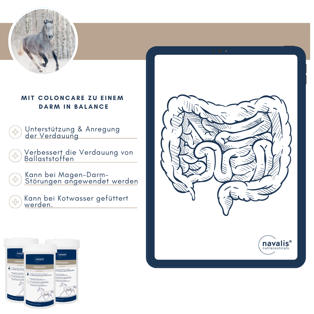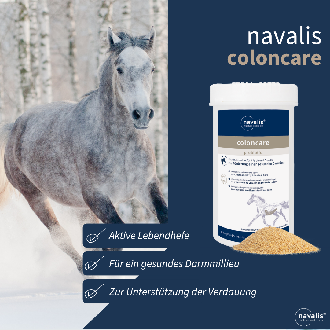 Damit die Darmflora eines Pferdes im Gleichgewicht bleibt. Der Verdauungstrakt eines Pferdes gilt nicht nur als sehr komplex, sondern auch als äußerst sensibel. Damit dieser seinen Aufgaben optimal nachkommen kann, benötigt es eine sich im Gleichgewicht befindliche Darmflora. Hierzu empfiehlt sich die Fütterung von Lebendhefen. navalis coloncare probiotic enthält Saccharomyces cerevisiae, eine sogenannte Lebendhefe. Dieses Probiotikum unterstützt die Gesundheit der Darmflora, regt den gesamten Verdauungsstoffwechsel an und vermindert Kotwasser und Durchfall. Darüber hinaus kann die Lebendhefe die Verdaulichkeit der Futterration verbessern, indem sie die Faserverdauung (Fermentation) auf der Ebene des Dickdarms sowie die Verdauung von Ballaststoffen unterstützt. navalis coloncare probiotic kann dazu beitragen, die Körperkondition (Body Condition Score, BCS) von Pferden mit einer sensiblen Verdauung bzw. Magen-Darm-Störungen zu verbessern und ein gesundes Darmmilieu (Darmflora) zu unterstützen.