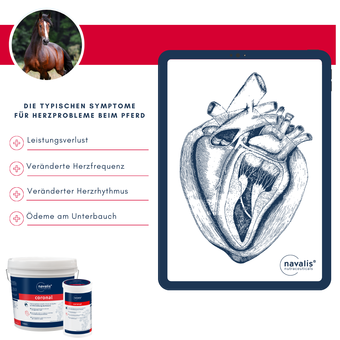 Für ein kräftiges Pferdeherz. navalis coronal enthält eine ausgewogene Kombination aus Mikronährstoffen und bioaktiven Substanzen (wie Flavonoide, Lektine, Viscotoxine, Terpenoide, Phenylpropanoide und Alkaloide, die in Weißdorn, Herzgespann und Ginseng enthalten sind), um oxidativen Stress zu reduzieren sowie den Energiestoffwechsel und die Durchblutung zu unterstützen. Eine unabhängige klinische Studie von Prof. Dr. Heidrun Gehlen an der Universität Hannover* untersuchte den Einsatz von navalis coronal bei Pferden mit chronischen Herzerkrankungen. Die Verabreichung von navalis coronal (25 g/Tag) über einen Zeitraum von drei Monaten an Pferde mit Herzproblemen führte zu: einer signifikanten Verbesserung mehrerer Parameter, die über ein Ultraschall am Herzen festgestellt werden können; einer Leistungssteigerung bei 3 von 6 Pferden mit Belastungsintoleranz, bei 4 von 19 Pferden, die initial ohne klinische Anzeichen einer Herzerkrankung vorgestellt wurden. *Gehlen, Goltz, Rohn, Stadler (2017): Auswirkungen eines Weißdornkombinationsproduktes (coronal horse) auf klinische und echokardiographische Befunde bei Pferden mit chronischen Herzerkrankungen, Pferdeheilkunde 23, 2 (März/April) 136–145. Damit eignet sich das coronal horse nachweislich sowohl zur Erhaltung eines gesunden Herz-Kreislauf-Systems als auch zur Unterstützung des Kreislaufs in besonders belastenden Situationen und unter zusätzlicher Beanspruchung. Auch ältere beziehungsweise Kreislauf-schwächere Pferde profitieren von der Fütterung während heißer Wetterperioden.