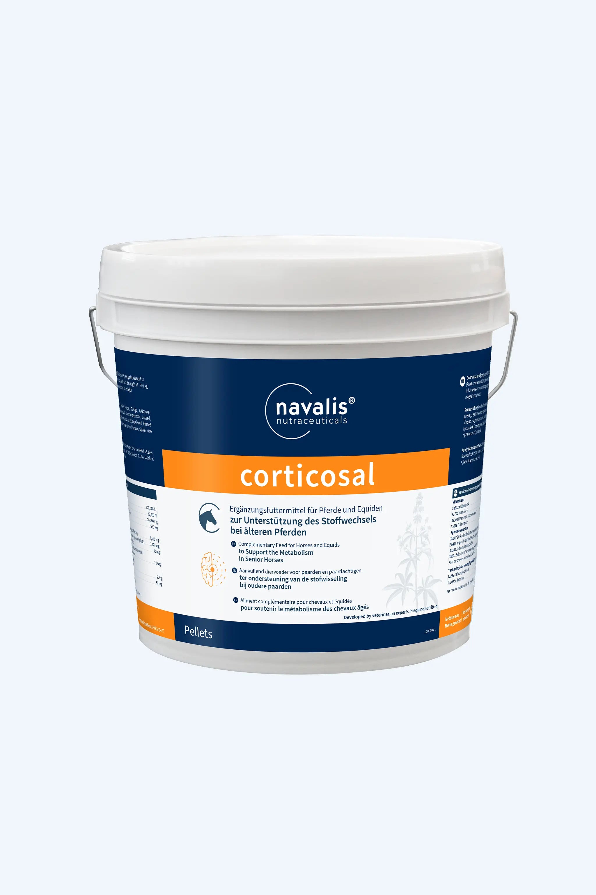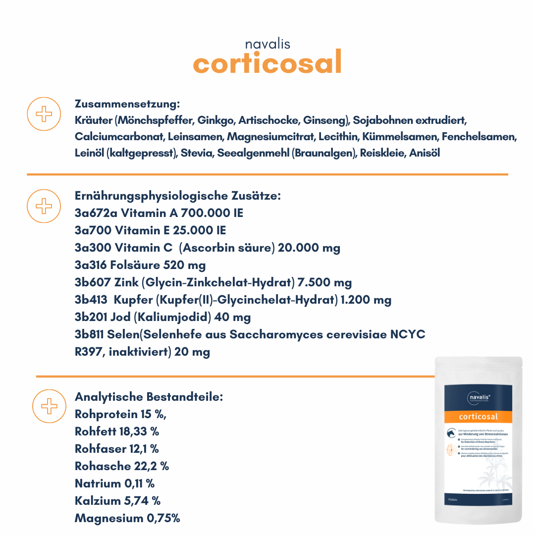 Kurz gesagt: navalis corticosal vereint u.A. Mönchspfeffer, Ginkgo, Artischocke, Ginseng und Magnesium, um speziell den Stoffwechsel bei älteren Pferden zu unterstützen. Von Tierärzten entwickelt und durch unabhängige Studien belegt.