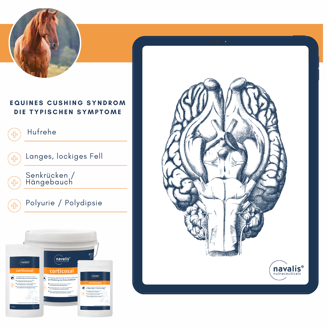 PPID (Cushing) nicht die Kontrolle über das Pferd übernehmen lassen. navalis corticosal wurde für den speziellen Mikronährstoffbedarf der Pferde entwickelt, die an PPID (Pituitary pars intermedia dysfunction, ehemals das Equines Cushing Syndrom) erkrankt sind. Schon im Anfangsstadium der Krankheit kann die Zuführung bedarfsgerechter Mikronährstoffe den entstehenden Dysbalancen sehr gut entgegenwirken. Eine klinische Studie* der Universität Berlin unter der Leitung von Prof. Dr. Heidrun Gehlen bestätigt die Wirkung von corticosal bei an PPID erkrankten Pferden: Der Einsatz von corticosal führte zu einer signifikanten Verbesserung der Fellwechselstörung, der Insulinwerte und des Verhaltens. Auch Polydipsie und Polyurie sanken merklich. Die Fütterung war nebenwirkungsfrei. corticosal fördert demnach mit seinem ganzheitlichen Konzept nachweislich das Wohlbefinden und die Lebensqualität der Pferde. Im corticosal sind neben dem Mönchspfeffer eine Reihe von Nährstoffen und weitere sekundäre Pflanzenwirkstoffe enthalten, die auf vielfältige Weise zur Regulierung und Modifizierung der Stoffwechselentgleisungen bei PPID beitragen. corticosal eignet sich zur Unterstützung bei allen an „PPID“ erkrankten Pferden.*Bradaric Z, May A, Gehlen H (2013): Use of the chasteberry preparation corticosal® for the treatment of pituitary pars intermedia dysfunction in horses. Pferdeheilkunde 6: 721-728