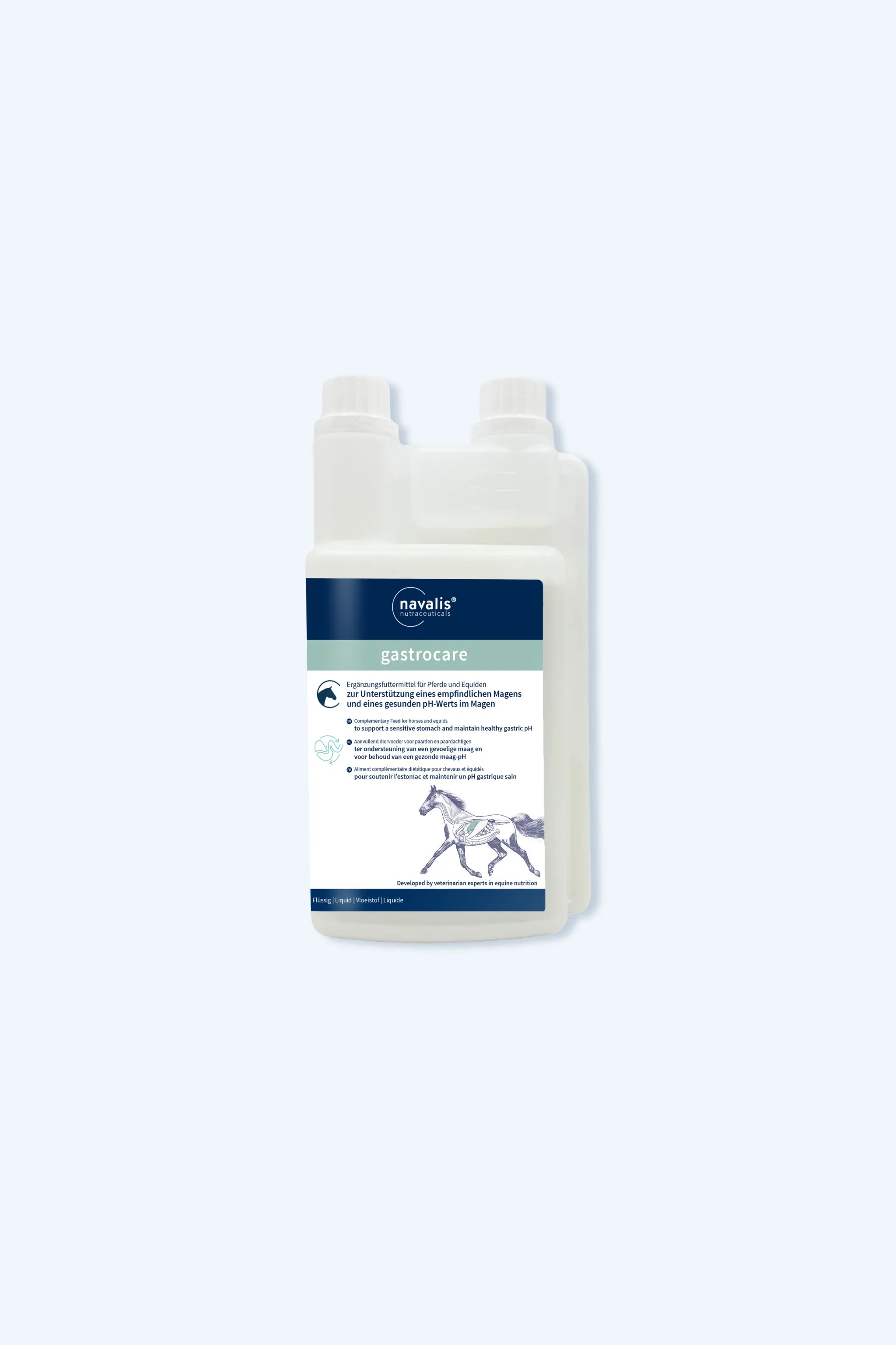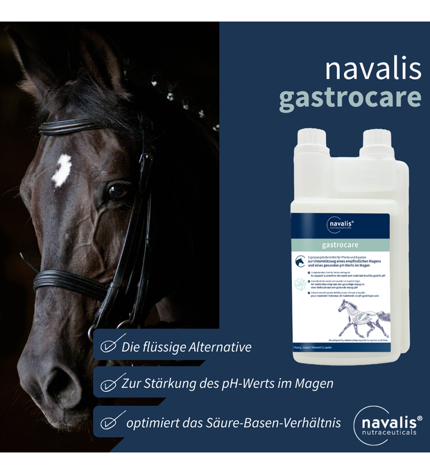 Zum Ausgleich des Magen-PHs bei Pferden. Magengeschwüre sind ein weit verbreitetes Problem bei Pferden, das circa 60 % aller domestizierten (nicht in freier Wildbahn lebenden) Pferde vom Fohlen über das Freizeitpferd bis hin zum Hochleistungssportler betrifft. Sie entstehen durch eine Entzündung der Magenwand beispielsweise in Folge einer Übersäuerung. Bei einem gesunden Pferd bleibt das Säure-Basenverhältnis im Magen aufgrund des beim Speicheln gebildeten und mit dem Futter geschluckten Bicarbonats stabil. Eben dieses Bicarbonat gilt als sogenannter Säurepuffer, der den Magen-pH-Wert im neutralen Bereich hält. Aufgrund von Stress, oder Erkrankungen kann der Magen-pH des Pferdes aus dem Gleichgewicht geraten, ein schmerzhafter Prozess beginnt. Symptome wie Blähungen, Krippenbeißen, Weben, Appetit- oder Konditionsmangel., können eben darauf hinweisen. Hier empfiehlt sich unser Produkt navalis gastrocare. Mit dem enthaltenen Natriumbicarbonat, ebenfalls ein Säurepuffer, ergänzt durch Magnesiumhydroxid kann das Säure-Basen-Verhältnis im Magen wieder ins Gleichgewicht gebracht und aufrecht erhalten werden. Dazu zeigt das Pferd wieder mehr Appetit, was eine körpereigene Bicarbonat-Bildung beim Fressen mit sich bringt. gastrocare eignet sich für Pferde allen Alters und Einsatzgebietes, die Verabreichung gelingt dank der flüssigen Darreichungsform problemlos.