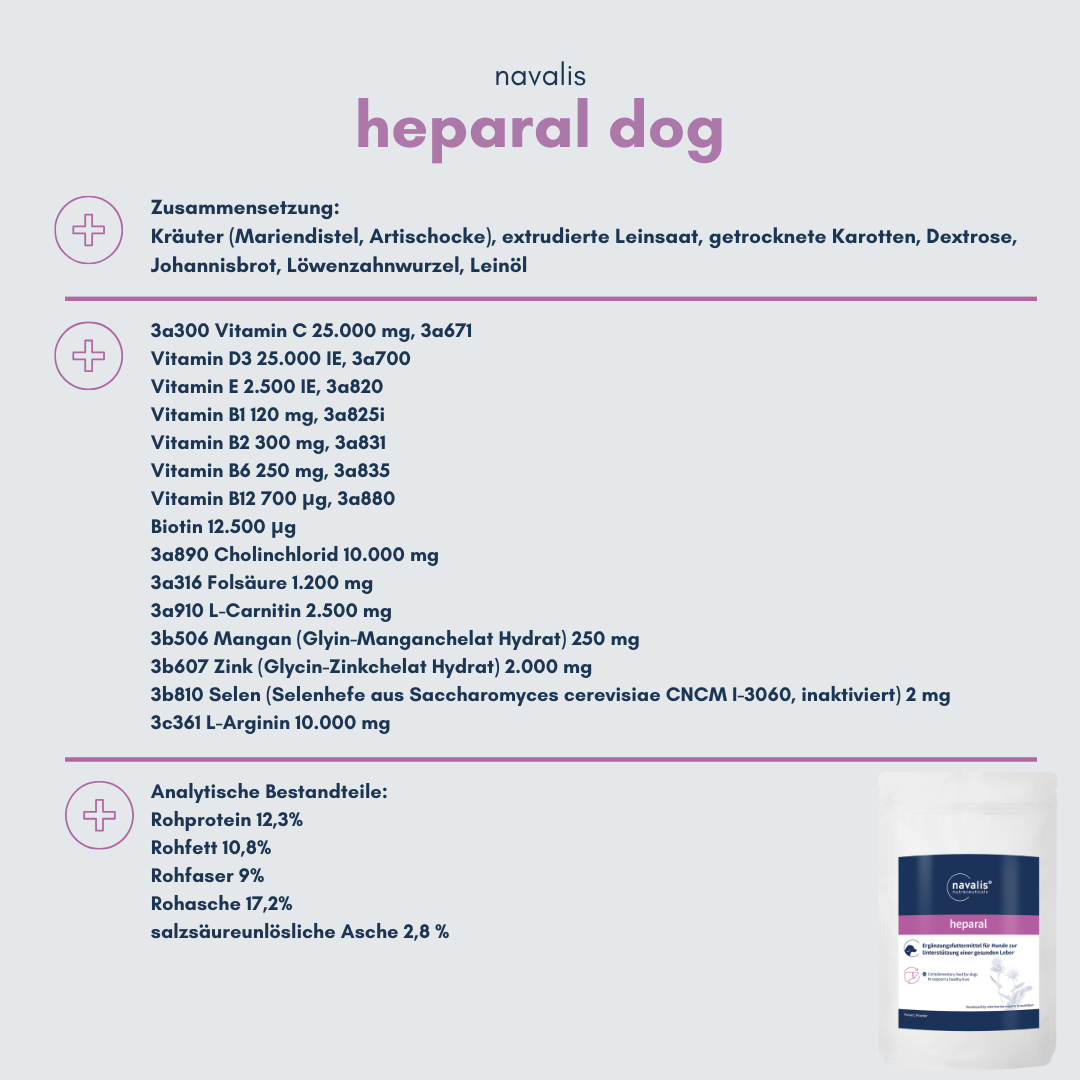 Vitamine: 3a300 Vitamin C 25.000 mg, 3a671 Vitamin D3 25.000 IE, 3a700 Vitamin E 2.500 IE, 3a820 Vitamin B1 120 mg, 3a825i Vitamin B2 300 mg, 3a831 Vitamin B6 250 mg, 3a835 Vitamin B12 700 µg, 3a880 Biotin 12.500 µg, 3a890 Cholinchlorid 10.000 mg, 3a316 Folsäure 1.200 mg, 3a910 L-Carnitin 2.500 mg, Spurenelemente: 3b506 Mangan (Glyin-Manganchelat Hydrat) 250 mg, 3b607 Zink (Glycin-Zinkchelat Hydrat) 2.000 mg, 3b810 Selen (Selenhefe aus Saccharomyces cerevisiae CNCM I-3060, inaktiviert) 2 mg, Aminosäuren: 3c361 L-Arginin 10.000 mg