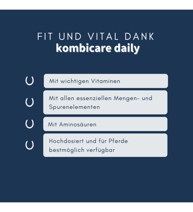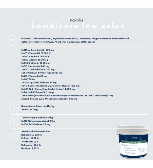 Für die tägliche Mineralstoff-Versorgung eines Pferdes. Um ein gesundes Pferd fit und leistungsstark zu erhalten, benötigt es, aufgrund der stark zurückgehenden Mineralstoff-Gehalte in den Böden Mitteleuropas eine qualitativ hochwertige Futterergänzung hinsichtlich Vitaminen, Mineralstoffen und Spurenelementen. Stumpfes Fell, Fellwechselprobleme, Leistungsschwäche, schlechte Hufe. All diese Symptome können auf ein schwaches Immunsystem hinweisen. Im navalis kombicare daily haben wir bei der umfassenden Zusammensetzung darauf geachtet, sämtliche Mineralstoffe an aktuellste wissenschaftliche Erkenntnisse anzupassen. Bei täglicher Fütterung kann somit zum einen Nährstoffmängeln vorgebeugt und zum anderen Nährstoffdefiziten entgegengewirkt werden.
