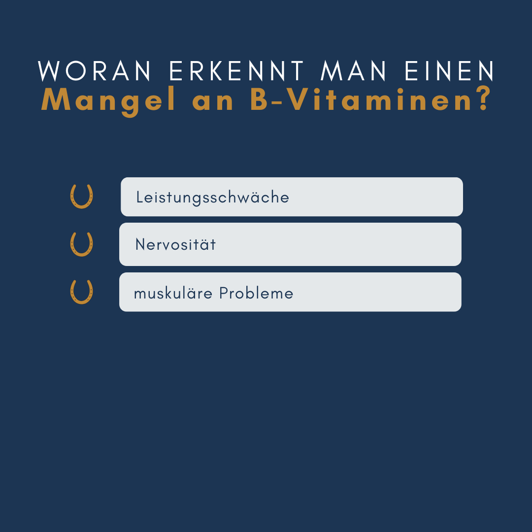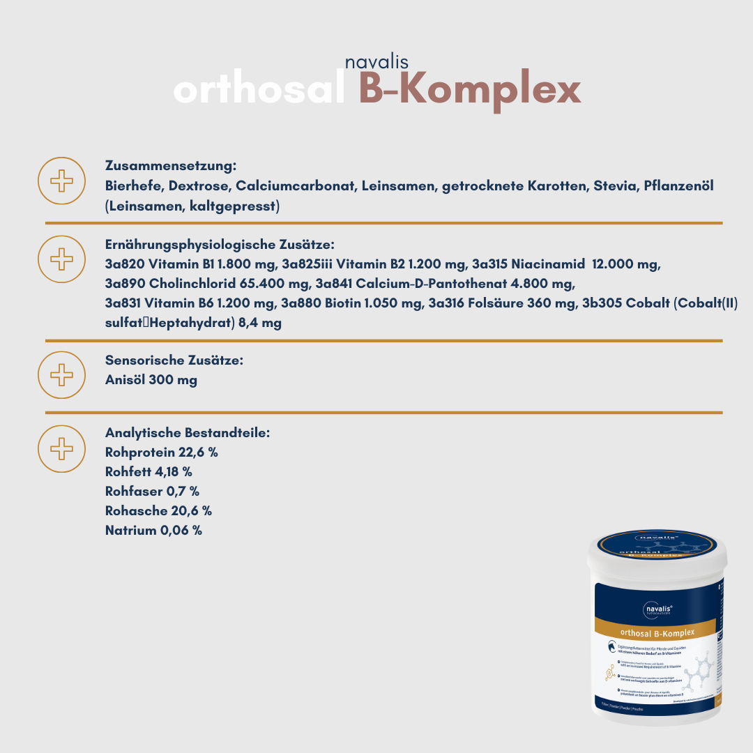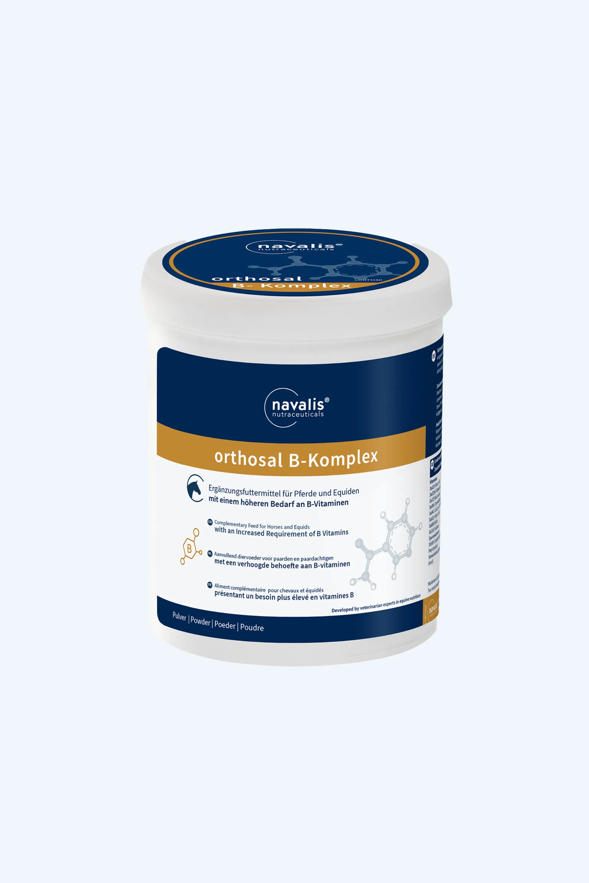 Natürliche Unterstützung für das Nervensystem beim Pferd. B-Vitamine sind essenzielle Kofaktoren zahlreicher Stoffwechselprozesse und spielen eine zentrale Rolle für die Funktion des Nervensystems. Sie sind maßgeblich an der Energiegewinnung beteiligt, unterstützen die Reizweiterleitung zwischen Nervenzellen und tragen zur Regeneration des Muskel- und Nervengewebes bei. Ein Mangel kann sich in Leistungsschwäche, erhöhter Nervosität oder muskulären Problemen äußern. Verschiedene Faktoren können den Bedarf an B-Vitaminen beim Pferd signifikant erhöhen: Erhöhter Leistungsanspruch durch Training oder Wettkämpfe; Phasen physiologischer Belastung wie Fellwechsel oder Anweiden; längere Medikamentengabe oder Erkrankungen, die den Vitaminhaushalt beeinflussen; stressbedingte Mehrbelastung, etwa durch Transport oder Umweltveränderungen. navalis orthosal B-Komplex liefert eine sorgfältig abgestimmte Kombination hoch bioverfügbarer B-Vitamine, die den Nervenstoffwechsel optimal unterstützen und einen erhöhten Bedarf zuverlässig ausgleichen. Die bedarfsgerechte Fütterung eignet sich sowohl zur täglichen Versorgung als auch zur gezielten Unterstützung in Phasen erhöhter Beanspruchung.