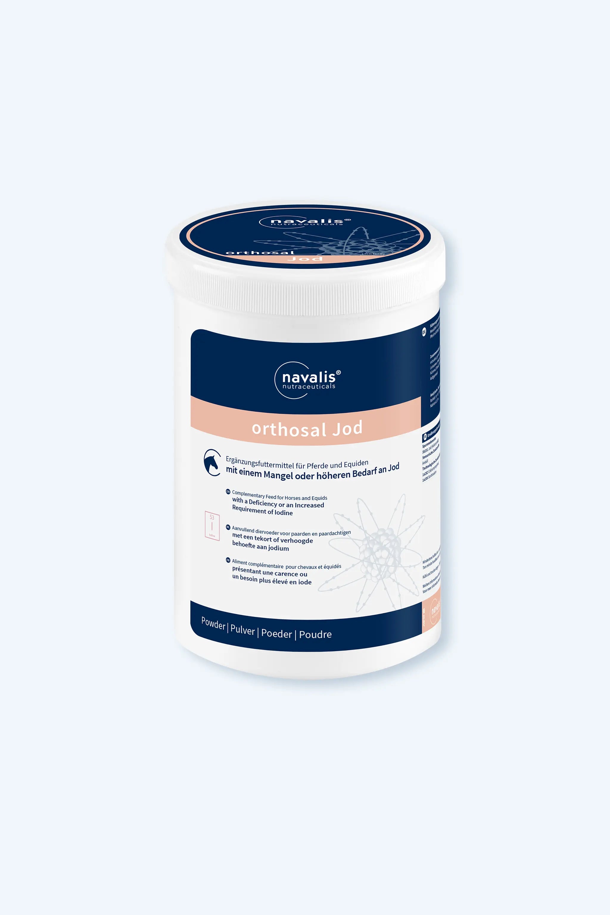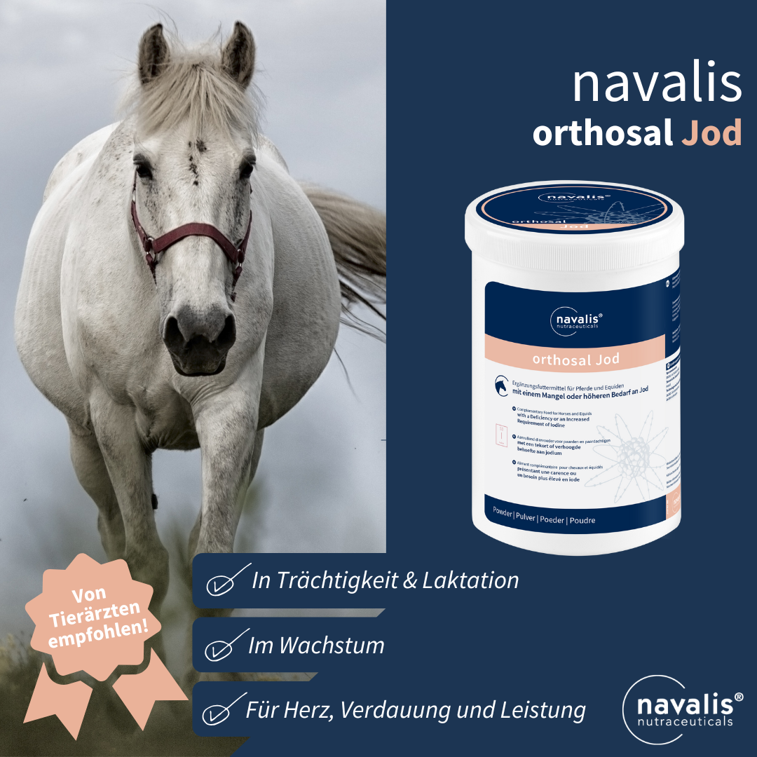 orthosal Jod – Unterstützt Schilddrüse, Stoffwechsel und Vitalität beim Pferd. Jod ist ein lebenswichtiges Spurenelement, das im Organismus für die Bildung der Schilddrüsenhormone Thyroxin (T4) und Trijodthyronin (T3) benötigt wird. Diese Hormone steuern zentrale Körperfunktionen wie Energiehaushalt, Stoffwechselaktivität, Körpertemperatur, Herz-Kreislauf-System, Verdauung, Fellqualität und Immunabwehr. orthosal Jod liefert natürliches Jod in hoch bioverfügbarer Form. Es eignet sich optimal zur gezielten Ergänzung bei nachgewiesenem Jodmangel oder erhöhtem Bedarf. orthosal Jod: unterstützt die Bildung und Regulation von Schilddrüsenhormonen; fördert Energieumsatz, Stoffwechselleistung und thermische Regulation; stärkt Abwehrkräfte, Fellqualität und Organfunktion; ideal bei erhöhtem Bedarf in Wachstumsphasen, Trächtigkeit, Laktation und im Alter; enthält natürlichen Blasentang als hochwertige Jodquelle. Da Jodmangel besonders in jodarmen Regionen im Binnenland häufig vorkommt und zu Stoffwechselträgheit, Leistungsabfall, Haut- und Fellveränderungen sowie Kropfbildung führen kann, ist eine bedarfsgerechte Jodzufuhr essenziell. orthosal Jod sorgt für eine stabile Schilddrüsenfunktion und unterstützt die physiologische Entwicklung und Vitalität des Pferdes.