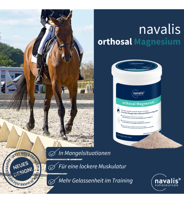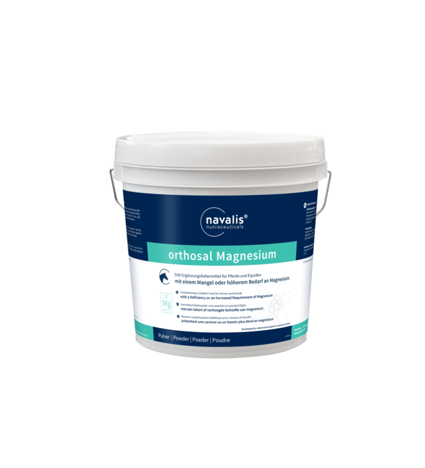 Magnesium - unentbehrlich für nervlich schwache und/oder verspannte Pferde. Zeigen sich Pferde aus unerfindlichen Gründen von Grund auf nicht mehr nervenstark, kann ein Magnesium-Mangel zugrunde liegen. Zwar enthalten Gras und damit auch Heu generell eine gute Portion Magnesium, so zeigen aktuelle Studien, dass die Gehälter in den Böden in den letzten Jahren stark ins Wanken gekommen sind. Die häufigsten Symptome eines Magnesium-Mangels: Nervosität, Unruhe, Reizbarkeit, Muskelzittern, Krämpfe, Verspannungen. Das orthosal Magnesium in seiner organischen Verbindung unterstützt den Ausgleich eines Magnesium-Mangels. Magnesium setzt nicht nur als Gegenspieler zu Calcium die Erregbarkeit von Nerven und Muskeln herab und führt dadurch zur Stressreduktion. Es bestimmt auch die Elastizität der Knochen, spielt eine große Rolle bei der Regulierung des Blutzuckerspiegels, regelt den Herzrhythmus und regt den Muskelstoffwechsel an. orthosal Magnesium basiert auf organisch gebundenen Magnesium-Verbindungen und fördert damit optimal den Ausgleich eines Magnesium-Mangels.