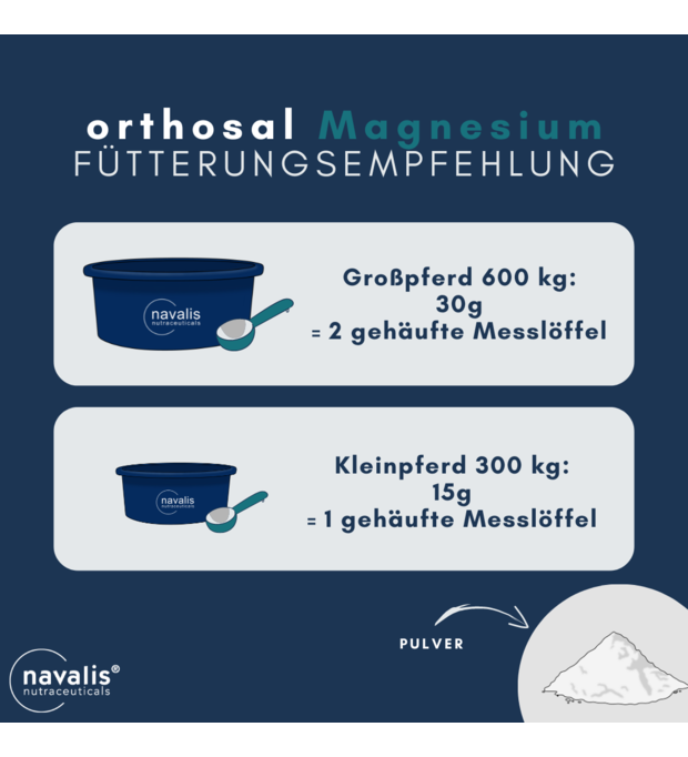 Täglich 2 bis max. 4 Messlöffel (entspricht 30-60g) für ein Pferd mit einem Körpergewicht von 600 kg.