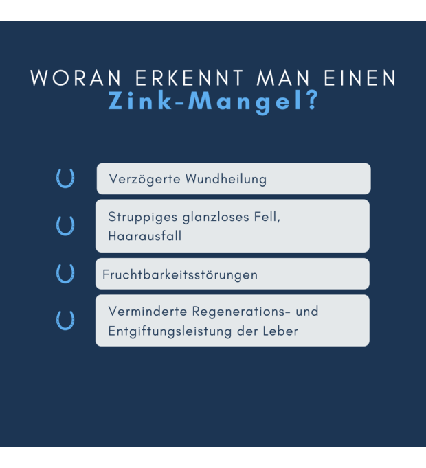 Zink – ein Muss für Fell, Haut und Hufe eines Pferdes. Eines der sich am häufigsten in einer Mangelsituation befindenden Spurenelement ist Zink. Als ein Grund hierfür gilt die drastische Abnahme an Nährstoffen in den Böden Mitteleuropas. Bei Zink handelt es sich um ein essenzielles Spurenelement für Pferde; das bedeutet, deren Organismus kann Zink nicht selbst bilden. Zink muss also über die Nahrung zugeführt werden. Die häufigsten Symptome eines Zinkmangels: schuppige Haut, Ekzeme, Mauke, schlechte Wundheilung, Infektionsanfälligkeit. Liegt ein Zinkmangel vor, eignet sich das organisch gebundene orthosal Zink perfekt, um diesen auszugleichen und den Zinkwert im gewünschten Level zu halten. Die organische Zinkkomplexe sorgen für eine bestmögliche Verfügbarkeit im Organismus. Zink trägt zur Steigerung der Immunabwehr bei und unterstützt maßgeblich die Funktion sowie die Regeneration der Haut, der Haare, der Hufe und der Schleimhäute (wie beispielsweise im Magen-Darm-Trakt oder in der Lunge). Das orthosal Zink trägt maßgeblich dazu bei, einen Zinkmangel beim Pferd auszugleichen.