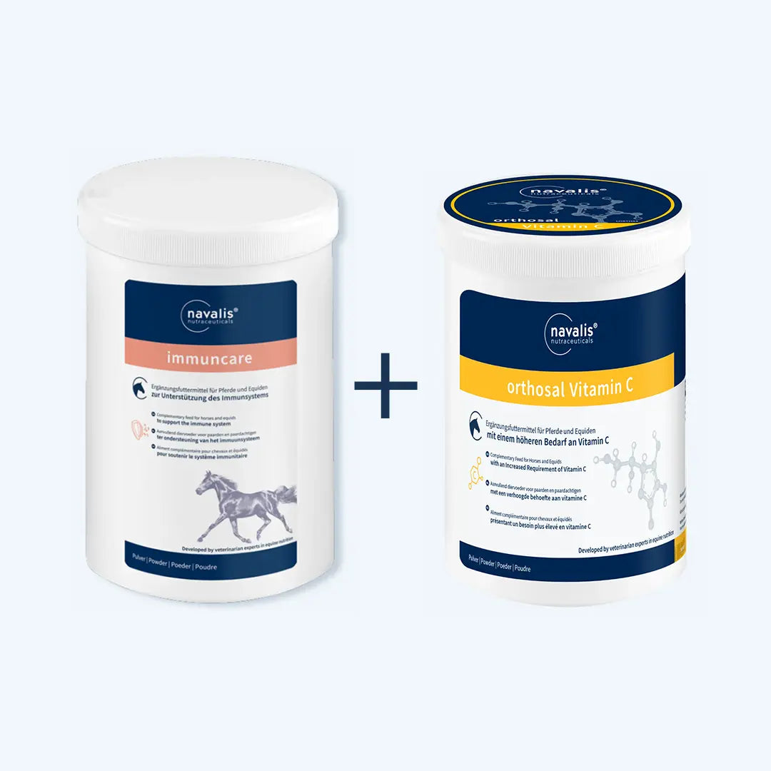Das navalis Immuncare® Pferdepaket bietet natürliche Unterstützung für ein starkes Immunsystem. Mit einem hohen Anteil an wertvollem Beta-Glukan aus der Zellwand der Bäckerhefe stärkt es die Abwehrkräfte und verbessert die Widerstandsfähigkeit des Pferdes. Ergänzt wird das Paket durch navalis Orthosal® Vitamin C, das die körpereigene Abwehr zusätzlich unterstützt. Ideal für Phasen erhöhter Belastung, Wintermonate, Virusausbrüche, Infektionen, intensive Trainingsphasen und die Erholung nach Erkrankungen. Eine gezielte Supplementierung stärkt die Immunabwehr nachhaltig und steigert die Vitalität Ihres Pferdes. Mit navalis Immuncare® und Orthosal® sorgen Sie für das Wohlbefinden Ihres Pferdes.